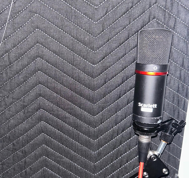 ⚪ Custom-built PVC studio with soundproof foam and moving blankets around the perimeter.⚪ Scarlett 2i2 Interface 2nd Gen⚪ Scarlett Studio Microphone⚪ Adobe Audition